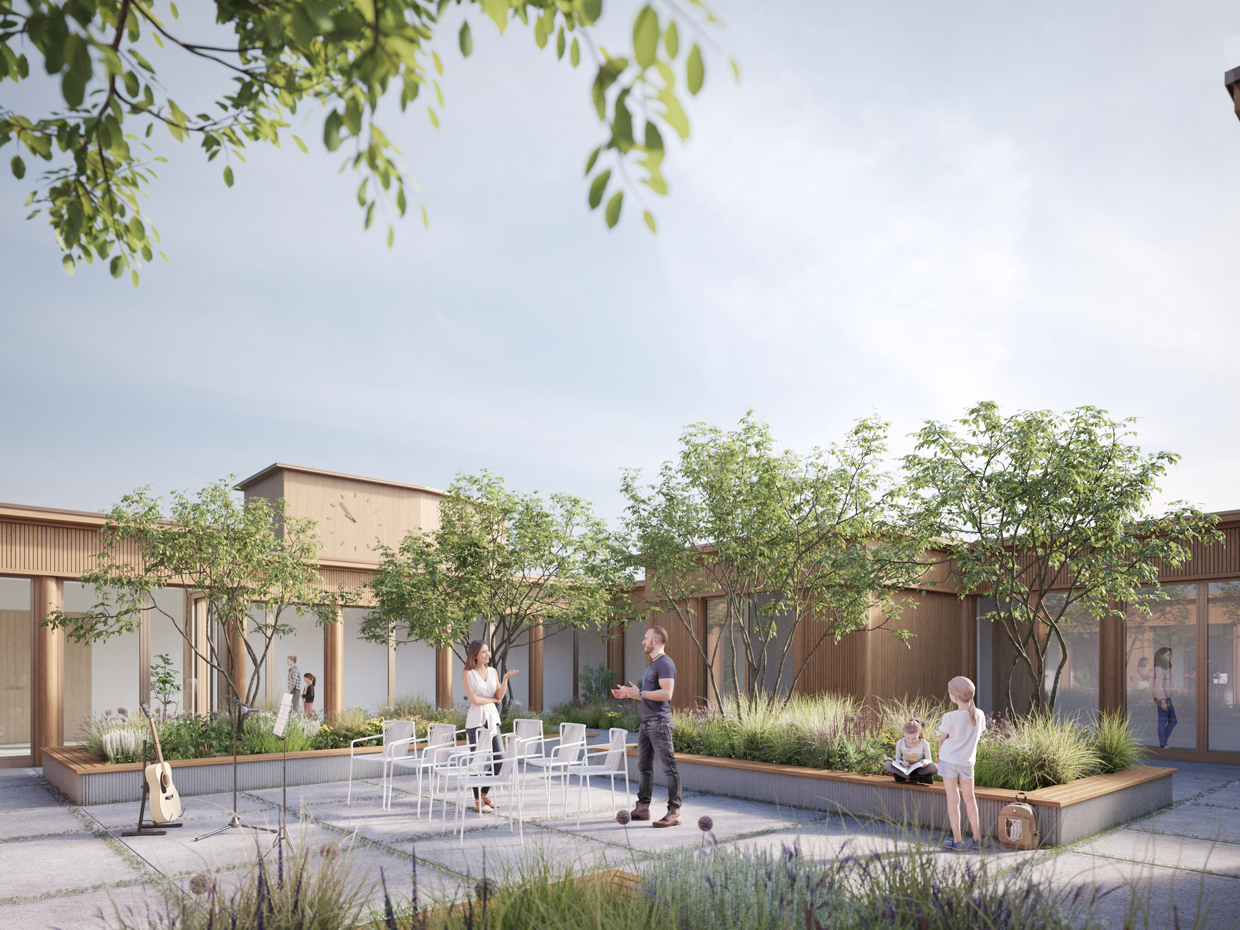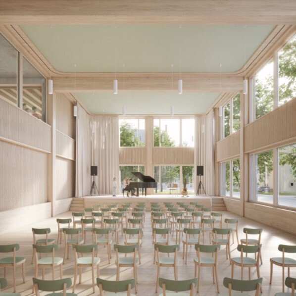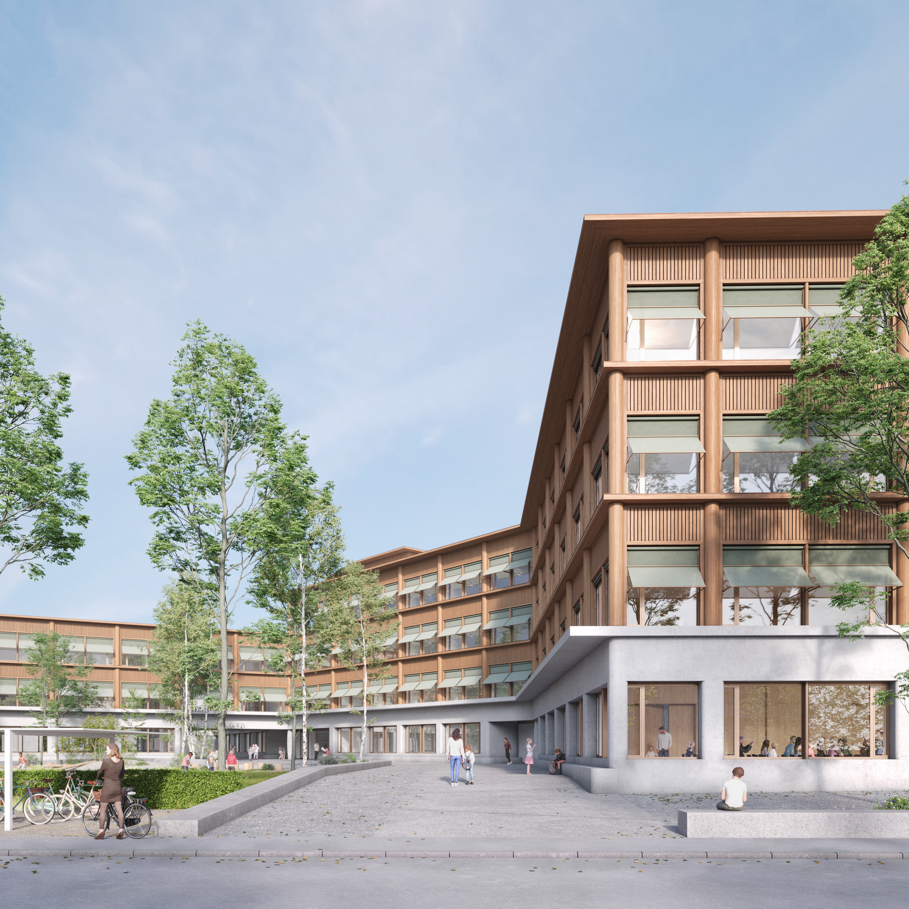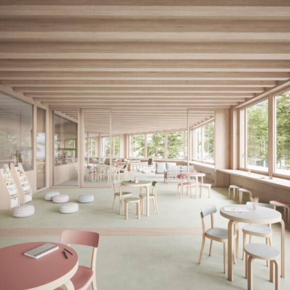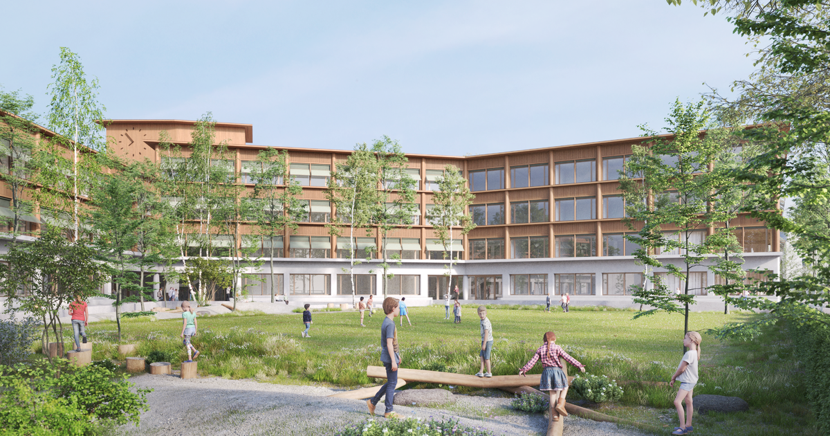Durch die Setzung einer dreifach abgestuften Gebäudekonstellation in einer geknickten L-förmigen Figur entsteht ein homogener Baukörper. Die Schulanlage beinhaltet eine Turnhalle, die Betreuung, den Kindergarten, die Klassenzimmer und die Gruppenräume, einen Singsaal und die Musikschule. Die Freiräume bilden mit dem Pausenplatz, der Spielwiese, dem Allwetterplatz und einem kleinen Pärklein die Schulhausumgebung. Temporäre Provisorien für Primarschule und Kindergarten müssen vor Ort auf dem Grundstück sichergestellt werden.
