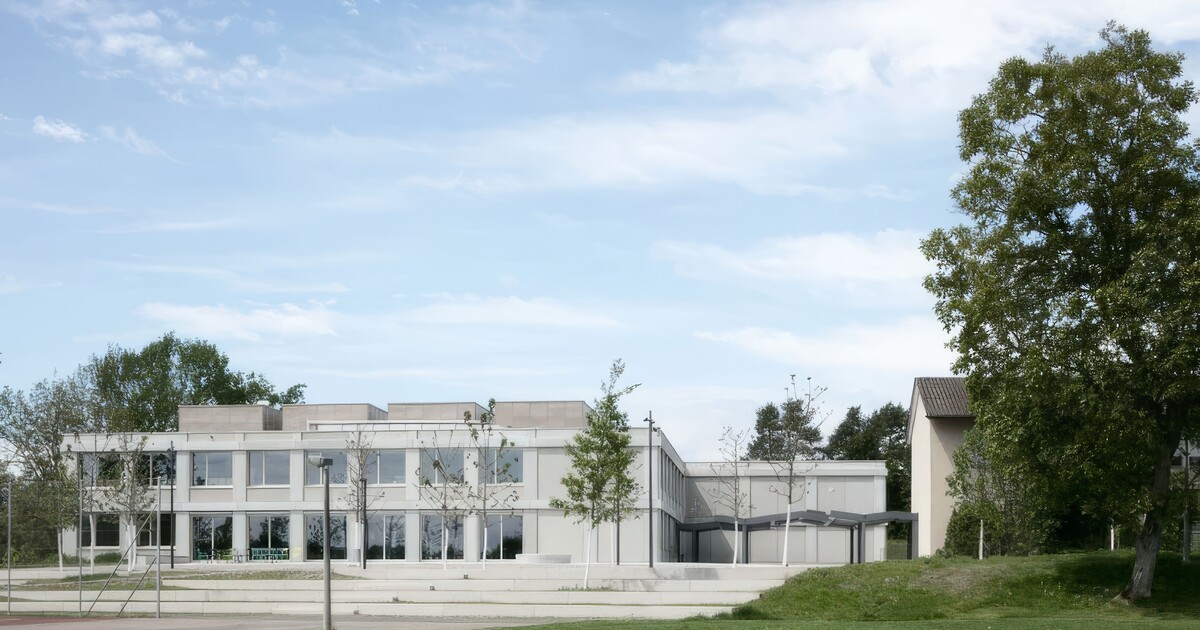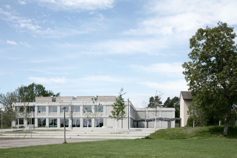 Die Schulanlage Hinterbirch besteht aus einer Reihung von länglichen Bauten, welche in den nach Süden sacht abfallenden Hang gesetzt sind. Auf einem tiefer gelegenen Plateau bilden grossflächige Aussensportanlagen den südlichen Abschluss des Geländes. Die Erweiterung ist auf drei Geschossen organisiert. Ein Geschoss der Turnhalle ist nordöstlich in den Hang eingegraben. Daran anschliessend orientieren sich die Klassenzimmer nach Osten, Süden und Westen. Die erdgeschossige Erschliessungsfigur bildet das Rückgrat der Räume und verbindet das ganze Haus. In der zweigeschossigen Halle treffen die einzelnen Trakte in einem zentralen Raum zusammen. Das Schulhaus materialisiert sich einem öffentlichen Bau angemessen. Nutzerfreundlichkeit und Dauerhaftigkeit bestimmen die Materialwahl. Das Tragwerk ist aussen in selbsttragende Recycling- Betonelemente gehüllt. Die Klassenzimmer und Garderoben sind mit Holz ausgekleidet. Der gute energetische Standard hat geringe Unterhaltskosten und geringe Verluste zur Folge. Der Baukörper weist verhältnismässig wenig Fenster nach Norden auf, womit Wärmeverluste im Winter auf ein Minimum reduziert werden.