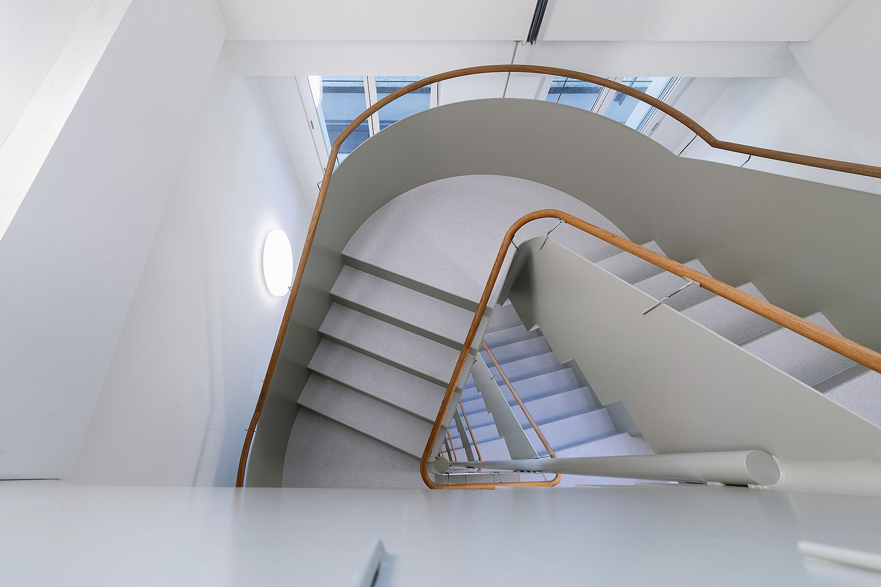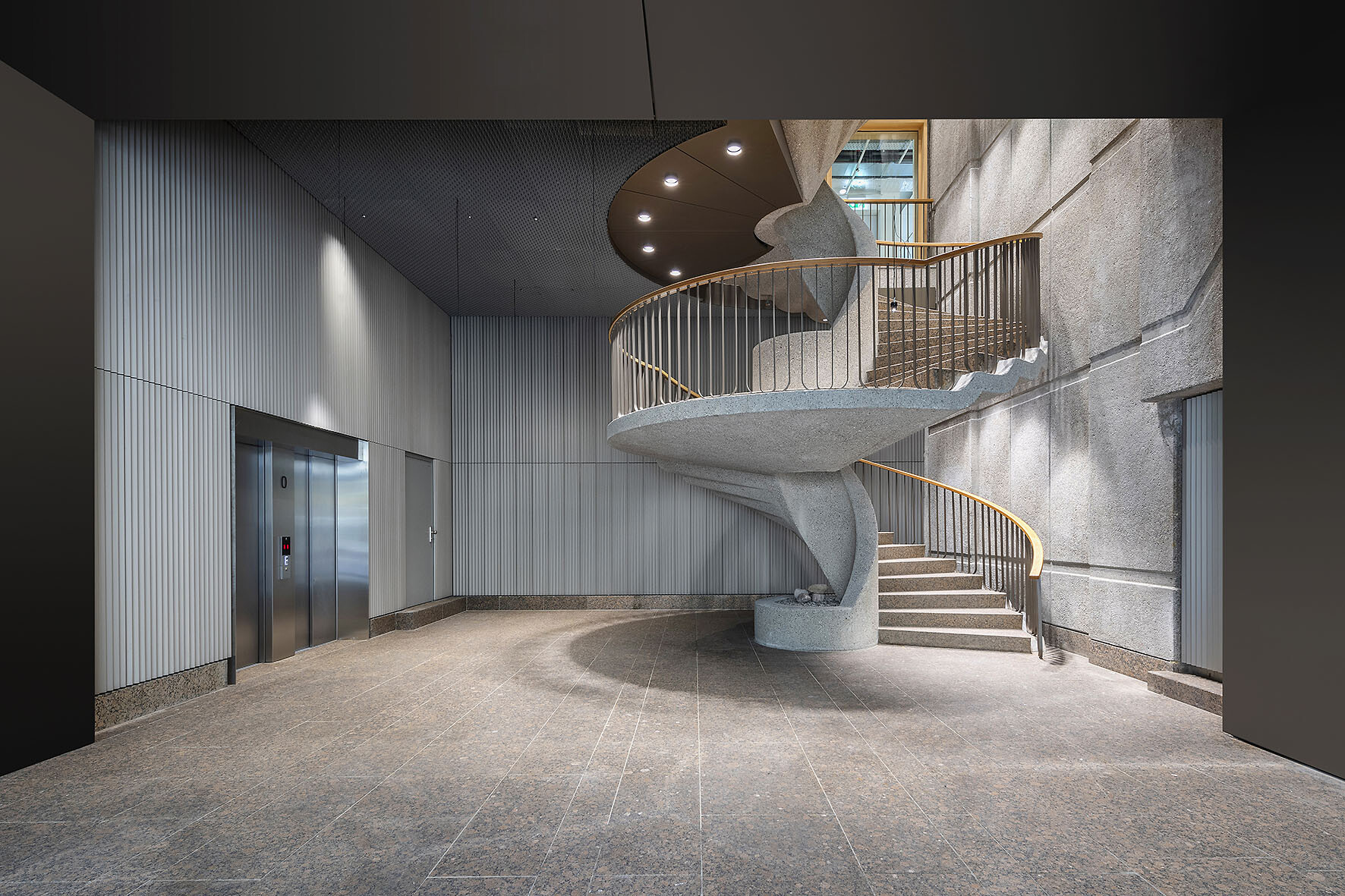 Ursprünglich wurde das Haus über zwei unabhängige Zugänge betreten, welche über einen gemeinsamen Lichthof in der Gebäudemitte verbunden waren. Im Zuge eines markanten Umbaus in den 70er Jahren wurde das Gebäude um ein Geschoss aufgestockt, die Fassaden verlängert und ein neues formgleiches Dach aufgesetzt. Die ursprüngliche Erschliessung wurde aufgelöst und anstelle des ehemaligen Lichthofs eine repräsentative Beton-Wendeltreppe platziert, welche mit skulpturaler Erscheinung die Bürogeschosse miteinander verbindet.