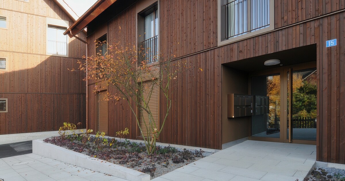 Die zwei Riegelbauten mit Holzverschalung und die drei Punkthäuser bilden am Rande des Zentrums von Mettmenstetten, angrenzend an Wohn- und Gewerbebauten, ein neues Quartier mit einer eigenen Identität. Der geschaffene innerdörfliche Raum des Quartiers beherbergt einen Gemeinschaftspavillon und dient als Treffpunkt für Jung und Alt. Eine gemeinsame Tiefgarage erschliesst die 4-geschossigen Wohnbauten der zwei Bauherrschaften.