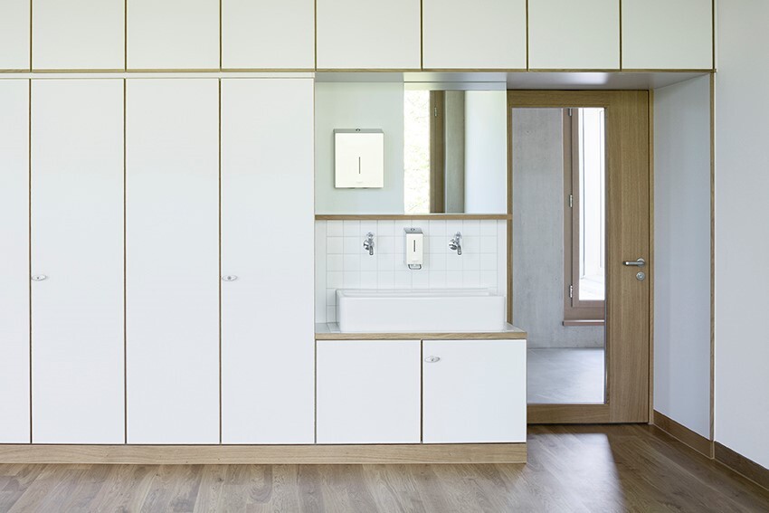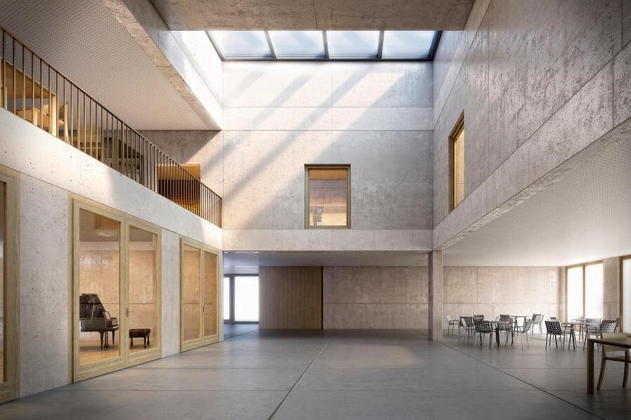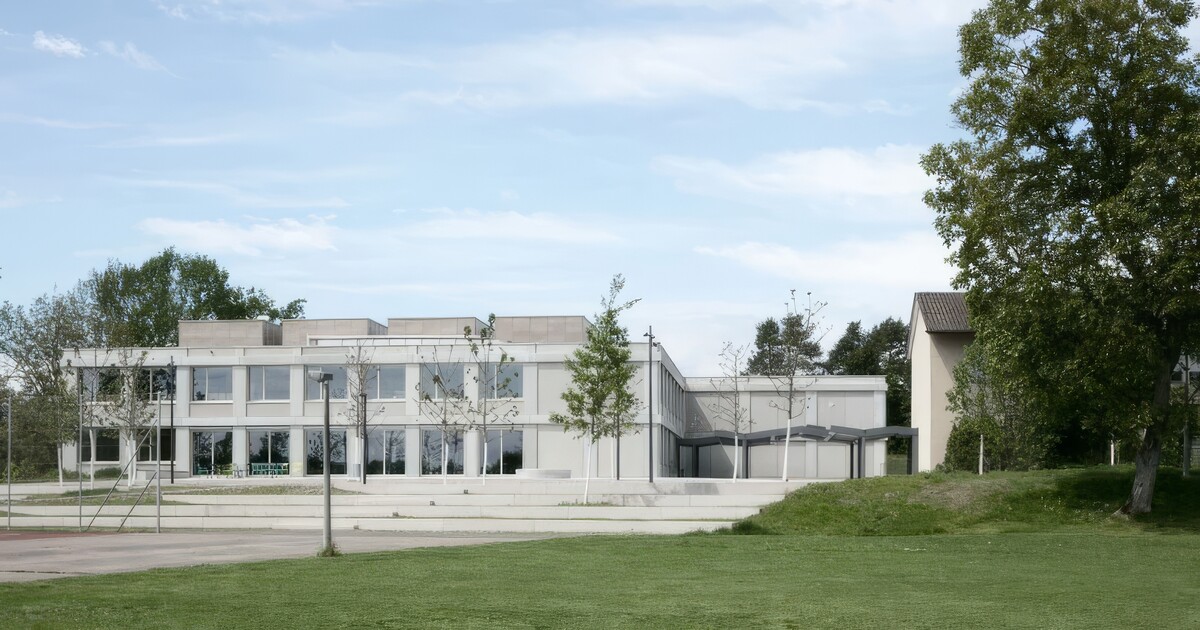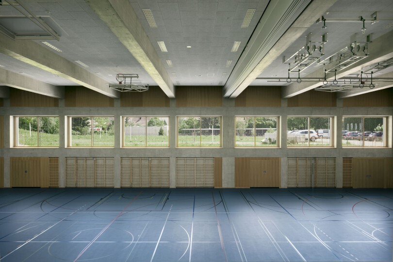 Die Schulanlage Hinterbirch besteht aus einer Reihung von länglichen Bauten, welche in den nach Süden sacht abfallenden Hang gesetzt sind. Auf einem tiefer gelegenen Plateau bilden grossflächige Aussensportanlagen den südlichen Abschluss des Geländes. Die Erweiterung ist auf drei Geschossen organisiert. Ein Geschoss der Turnhalle ist nordöstlich in den Hang eingegraben. Daran anschliessend orientieren sich die Klassenzimmer nach Osten, Süden und Westen. Die erdgeschossige Erschliessungsfigur bildet das Rückgrat der Räume und verbindet das ganze Haus. In der zweigeschossigen Halle treffen die einzelnen Trakte in einem zentralen Raum zusammen. Das Schulhaus materialisiert sich einem öffentlichen Bau angemessen. Nutzerfreundlichkeit und Dauerhaftigkeit bestimmen die Materialwahl. Das Tragwerk ist aussen in selbsttragende Recycling- Betonelemente gehüllt. Die Klassenzimmer und Garderoben sind mit Holz ausgekleidet. Der gute energetische Standard hat geringe Unterhaltskosten und geringe Verluste zur Folge. Der Baukörper weist verhältnismässig wenig Fenster nach Norden auf, womit Wärmeverluste im Winter auf ein Minimum reduziert werden.