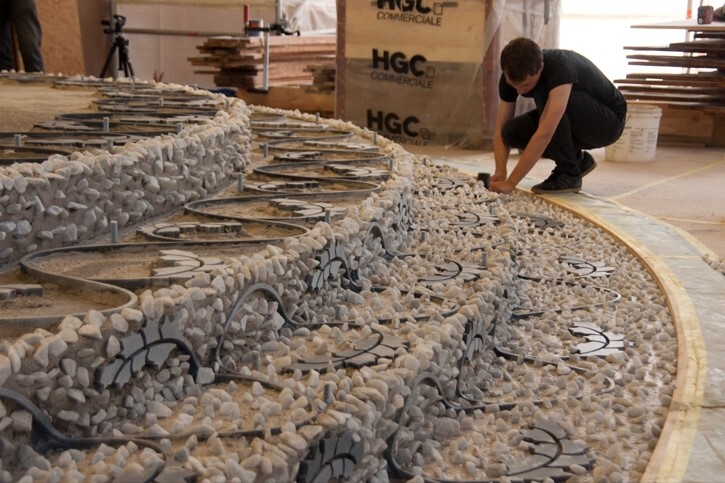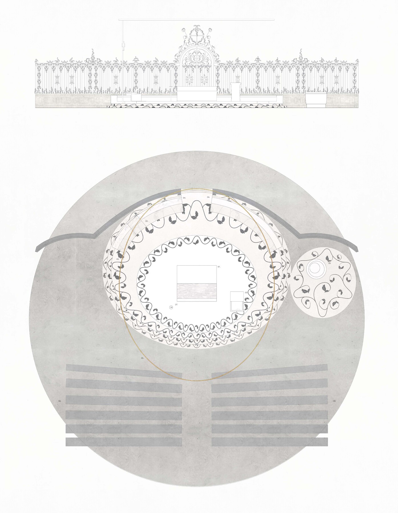 Zwei Hauptelemente des Entwurfes bildeten die vertikale Verbindung zwischen neuem Altar und Kuppel. Zum einen ist es der Sockel des Altars, der aus konzentrisch, oval ausgeformten Stufen besteht, die im Rücken von der konkaven Chorgittermauer gehalten werden und zur Gemeinde hin nach vorne drängen. Ein zarter Fries schmückt den Rand einer jeden Stufe und verleiht eine optische Tiefe.