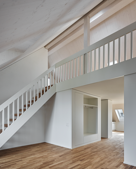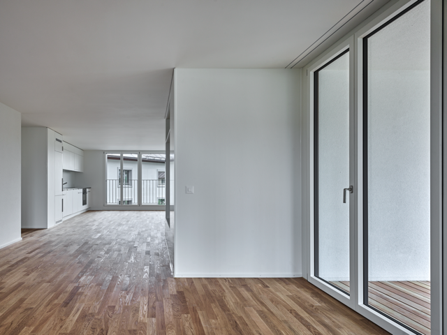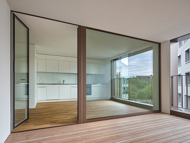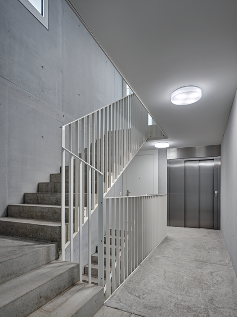 Auf auskragende Balkone wurden bei den orthogonalen Grundformen der Wohnhäuser bewusst verzichtet. Die privaten Aussenräume der Wohnungen wurden als Loggien ausgebildet und ins Volumen der Gebäude integriert. Die drei rollstuhlgängigen Wohnhäuser der Wohnbaugenossenschaft "maettmi50plus" bieten Wohnraum für Menschen in der dritten und vierten Lebensphase, während die Riegelbauten genügend Raum für Familien bieten.