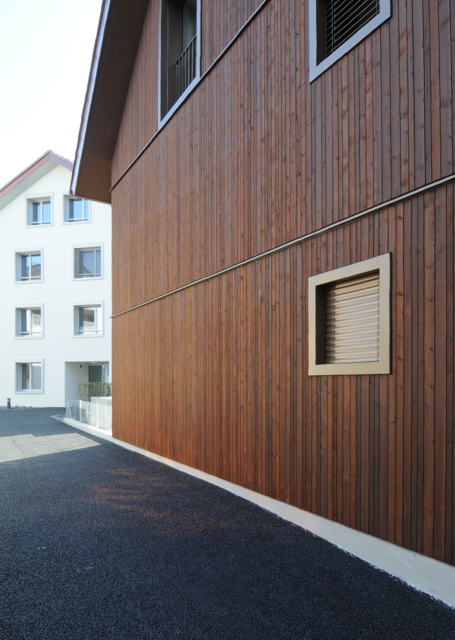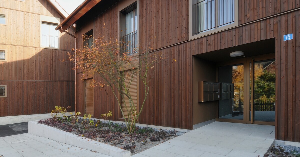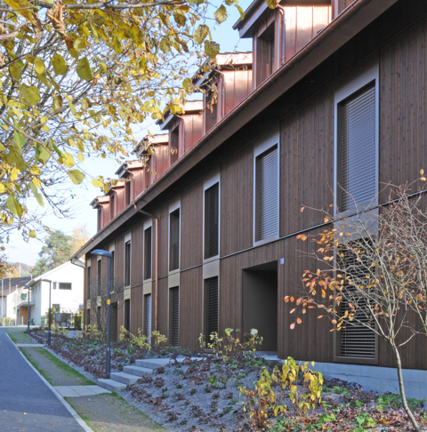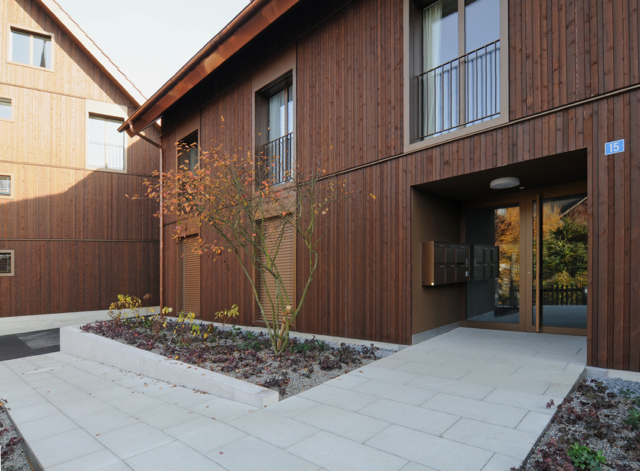 Die zwei Riegelbauten mit Holzverschalung und die drei Punkthäuser bilden am Rande des Zentrums von Mettmenstetten, angrenzend an Wohn- und Gewerbebauten, ein neues Quartier mit einer eigenen Identität. Der geschaffene innerdörfliche Raum des Quartiers beherbergt einen Gemeinschaftspavillon und dient als Treffpunkt für Jung und Alt. Eine gemeinsame Tiefgarage erschliesst die 4-geschossigen Wohnbauten der zwei Bauherrschaften.